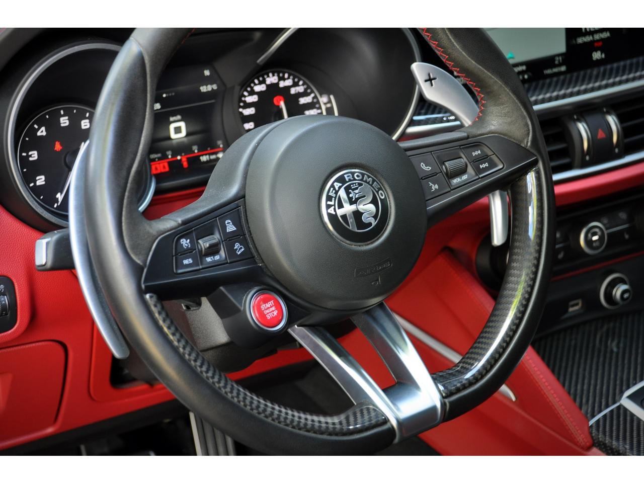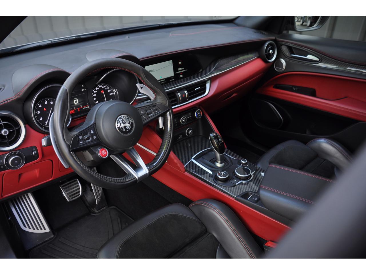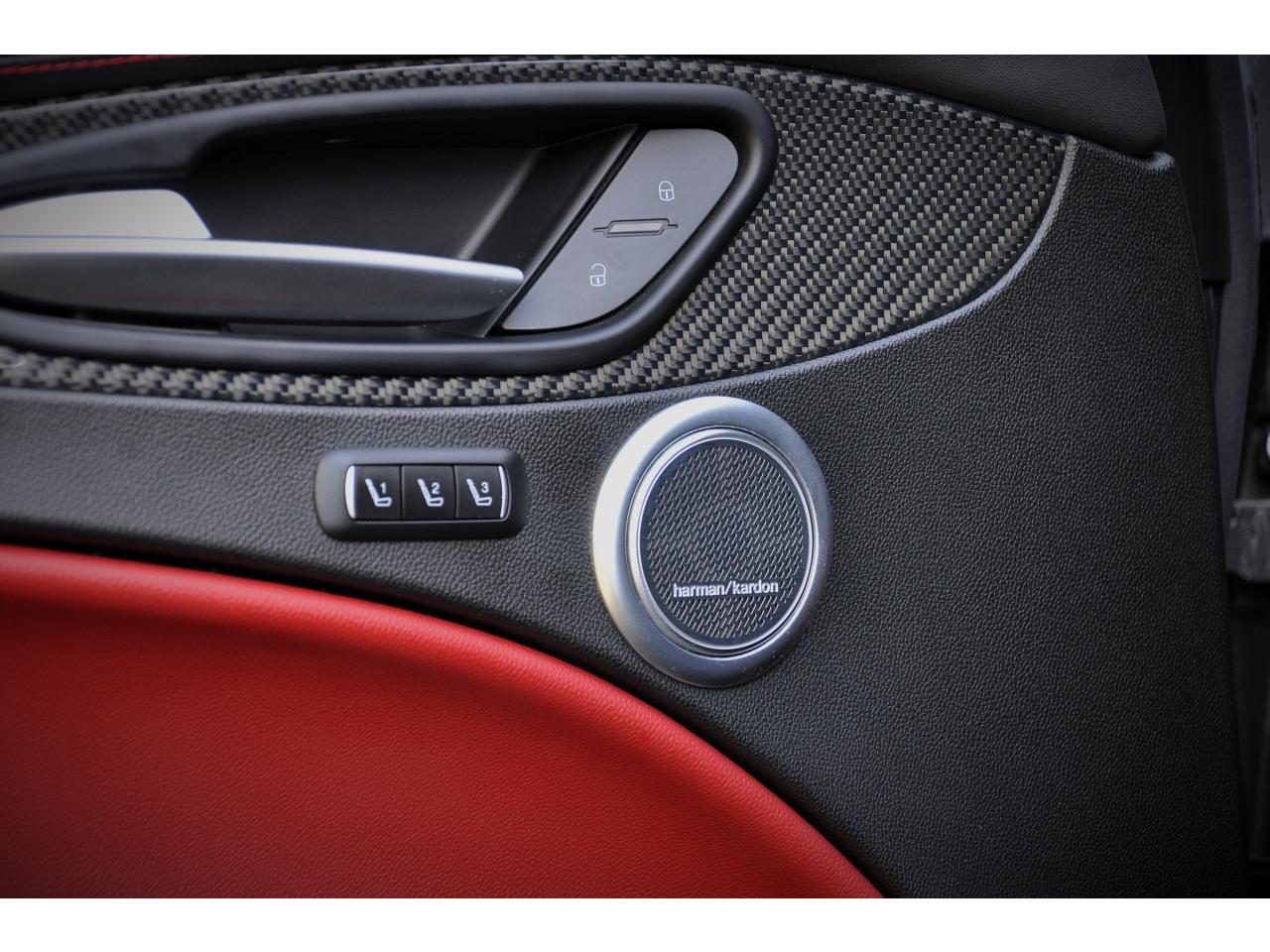 8 haut-parleursAlfa Chassis Domain ControlBOITIER COMMANDE VALVE ECHAPPEMENTAlfa DNA Pro (Mode Race)Avertisseur de dépassement de ligne blanche (LDW)Badge QuadrifoglioBanquette arrière rabattable 40/20/40Bouton démarreur au volantCartographie EuropeClimatisation automatique bi-zone, avec aérateurs à l'arrièreContour des vitres latérales Noir LaquéEssuie-glaces avant automatique avec détecteur de pluie et allumage automatique des feuxEtriers de frein anodisés avec inscription rougeFeux arrière à LEDFrein de parking électroniqueFreinage d'urgence autonome (AEB)Grille avant QuadrifoglioHayon arrière motorisé avec mémorisation de la hauteur d'ouvertureInserts de planche de bord, tunnel central avant et portières en carboneJantes en alliage 20" QuadrifoglioKit “Fix&Go”Pack Confort PlusPack Driver Assistance PlusPack EclairagePalettes de changement des rapports au volant en aluminium brosséPare-chocs arrière sportPédalier en aluminium SportPeinture pastel Rouge AlfaPlanche de bord en cuir avec surpiqûresPrise USB frontaleRadars de stationnement arrièreRégulateur de vitesseRétroviseurs extérieurs rabattables électriquementRotary PadSièges sport en cuir/AlcantaraSortie d'échappement Quadrifoglio (4 sorties)Suspension activeSystème Alfa Connect (Radio, MP3, Aux-in, Bluetooth)Système d'aide à la descenteSystème d'alerte anti-collisions (FWC) avec détection piétonsSystème de freins integré (IBS)Système Navigation 3D 8,8" avec CarPlay/Android Auto, Radio Numérique et instrumentation de bord 7'' TFTSystème Stop & StartTapis de sol QuadrifoglioVolant sport en cuir Quadrifoglio