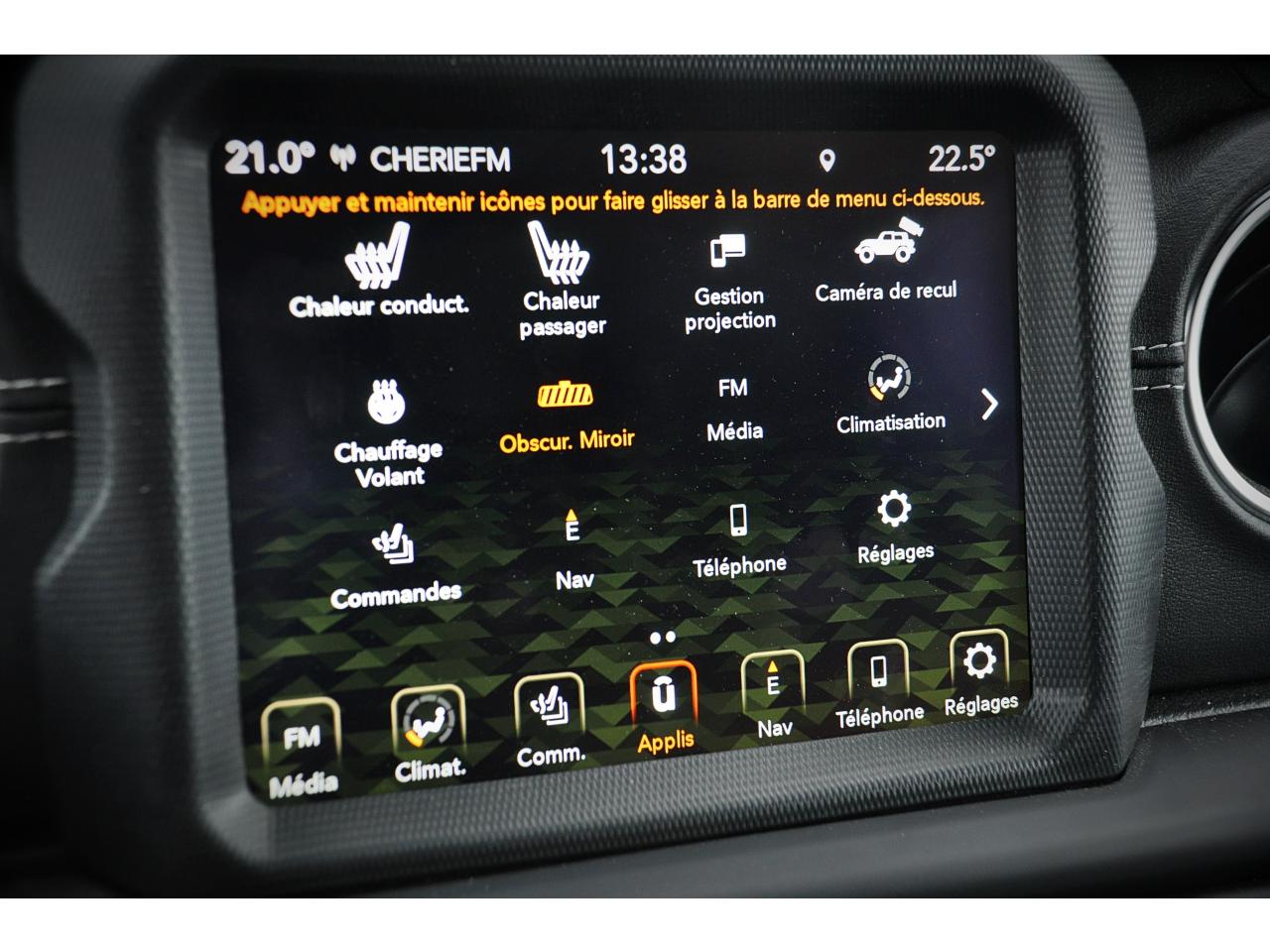 ABS (Antiblocage de roues)Airbags frontaux et latérauxJANTES BALLISTIC 18 PAllumage automatique des projecteursBanquette arrière rabattable en 2 partiesCâble de recharge pour prise de courant domestique (1,8kW) (mode 2, type 2)Calandre couleur carrosserieCaméra de reculCapteurs de stationnement avantClimatisation automatique bi-zoneConnexions Apple CarPlay et Android AutoCouvre roue de secours rigideCrochets de remorquage bleusEclairage intelligent (commutation automatique feux de croisement/feux de route)Élargisseurs d'ailes couleur carrosserieESP - Système de régulation du comportement dynamiqueFinitions extérieures Bright Accent (calandre, coques de rétroviseurs)Hard-top modulaire Freedom Top couleur carrosserie (3 pièces)Insert planche de bord en TEP noir, surpiqûres grisesJantes alliage 18" pneus Bridgestone Dueler HT 685 255/70 R18 T (M+S)KESSY: ouverture et démarrage sans cléKit fumeurLimiteur de vitesseMarche-piedsOrdinateur de bordPack sécuritéPare-soleil avant avec miroir éclairéPorte-gobelets rétro-éclairésPrise 12V avant et arrièreProjecteurs antibrouillardProjecteurs avant LEDRadar de reculRépartiteur électronique de freinage REFRétroviseur intérieur électrochromeRétroviseurs avec réglage électrique et fonction dégivrageRevêtement intérieur insonorisant sur le Hard topSellerie cuirSiège conducteur réglable 6 points + lombaire 2 pointsSiège passager réglable dans 4 directionsSièges avant chauffantsSurveillance de l'angle mort et système de détection de présence arrièreSystème audio Premium Alpine 8,4'' + 8 haut-parleurs + subwooferSystème de contrôle de la pression des pneusSystème de navigation à écran tactile Uconnect 8,4"Tapis de sol avant/arrière et tapis de coffreTransmission intégrale Select-Trac Time 2.72:1Vitres arrières surteintéesVitres électriquesVolant cuir multifonction chauffant