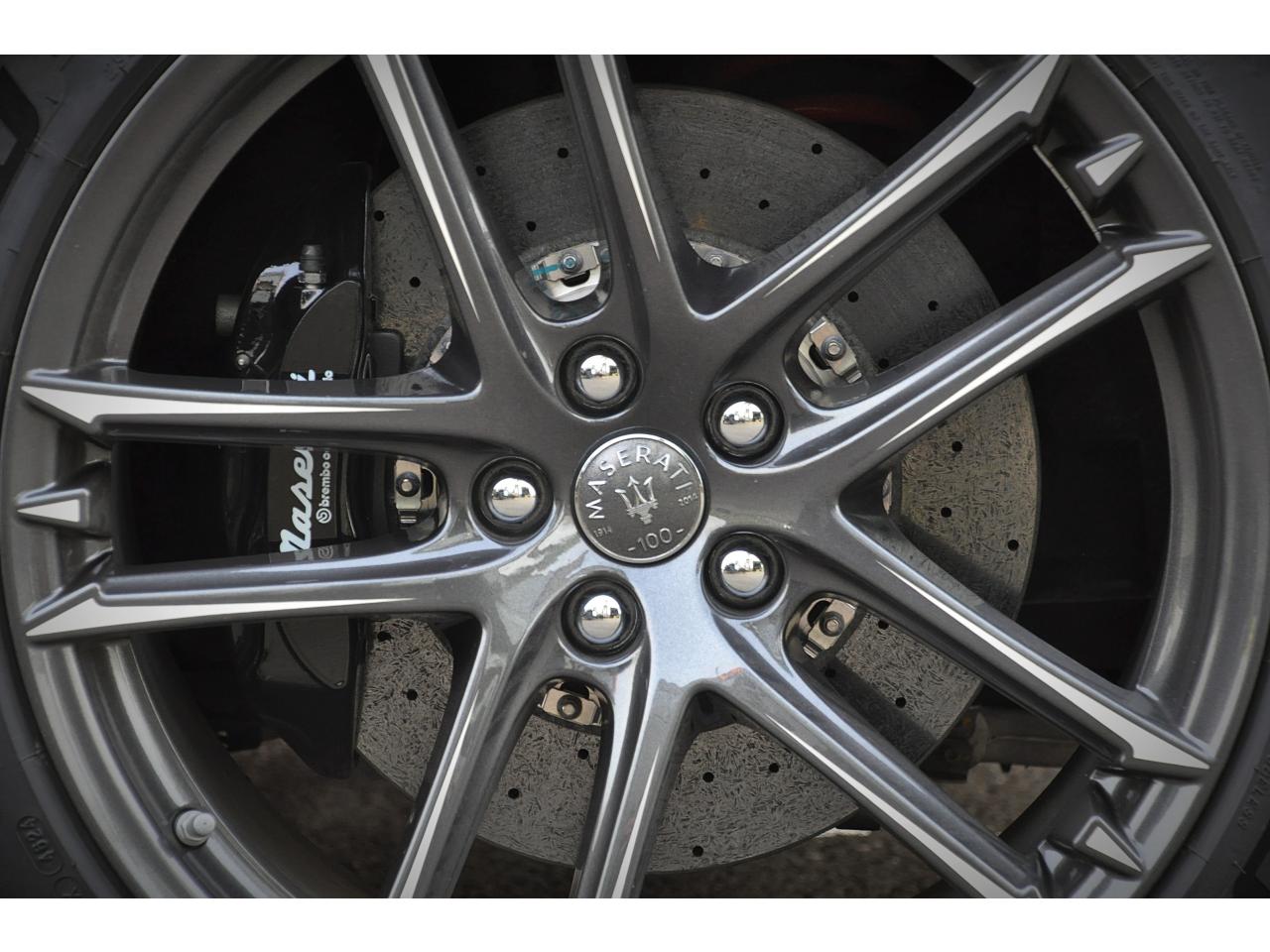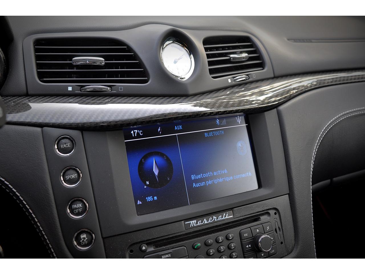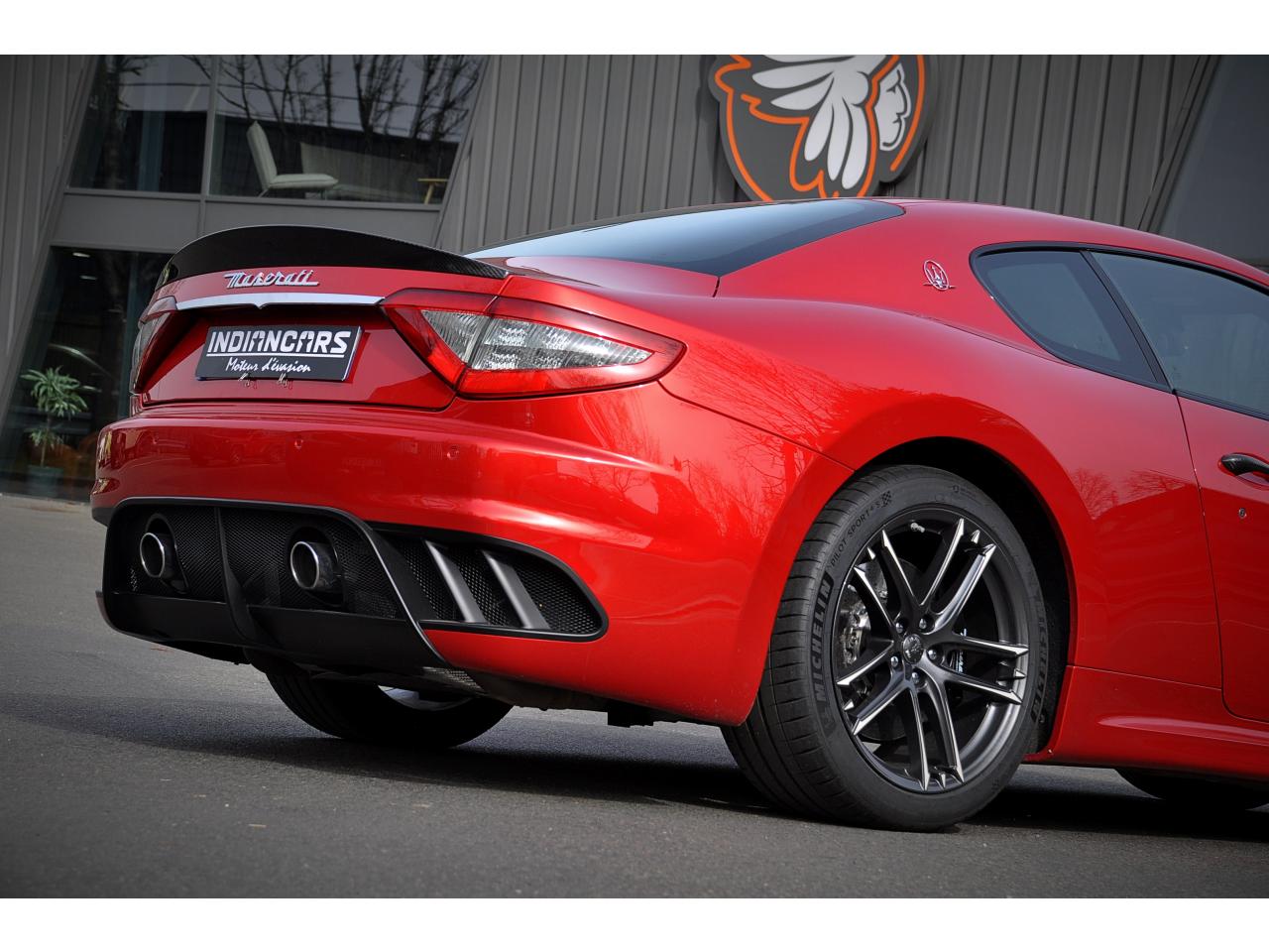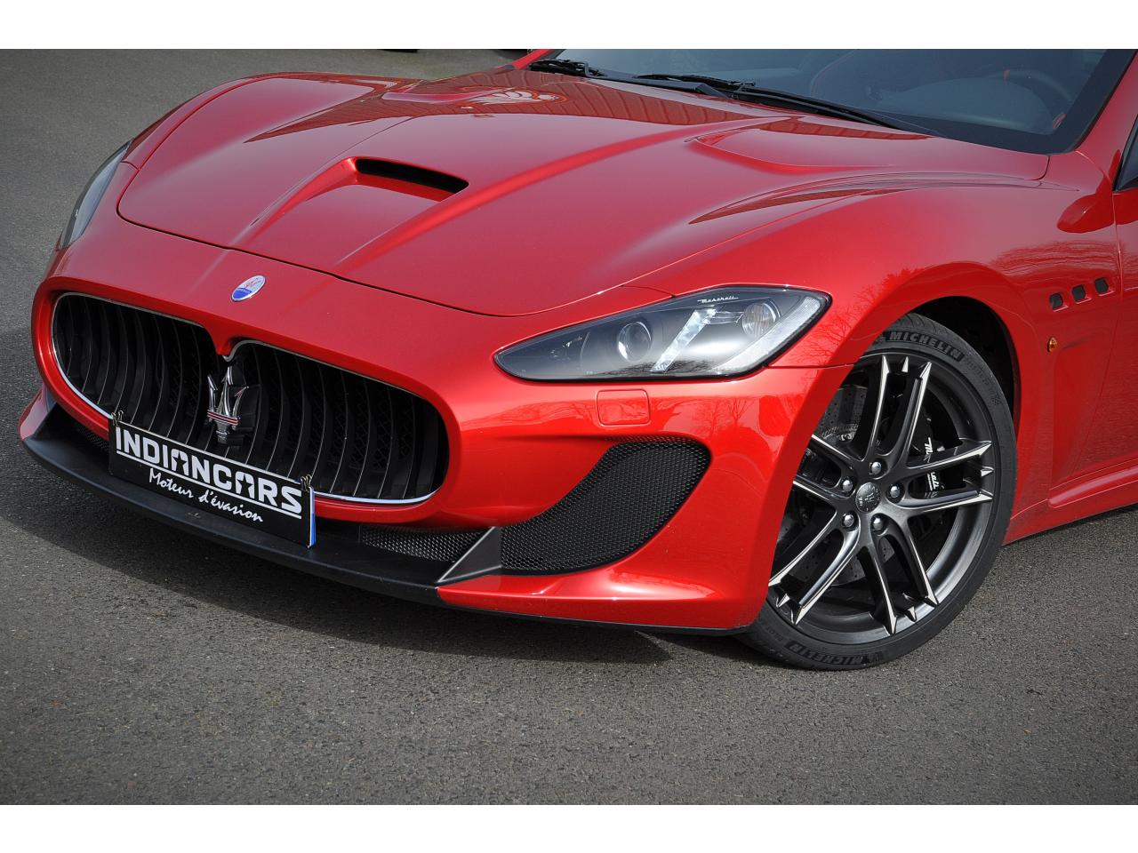 2 sorties d'échappement sport centrales, en acier inoxidable chromé, valves pneumatiques contrôlées par le bouton "Sport/Course"ABS antiblocage des roues avec répartiteur de freinage EBDAccoudoir avant rabattable avec éclairage intérieurAirbags ( avant, latéraux et pavillon)Alarme périmétrique, volumétrique et anti-soulèvementAllumage automatique des projecteursAnti-patinage (ASR)Assistance électrique d' ouverture pour les portes et le coffreBecquet arrièreBoutons pour modes Sport et CourseCalandre avant à barres verticales noiresCalandre noireCapot moteur en fibre de carbone peint, avec deux sorties d'air sur les cotésCapteur de pluieCapteurs de parking ARCeintures de sécurité à prétensionneurClimatisation automatique bi-zones avec 2 aérateurs à l'arrièreCompteur digitalCouverture de coffre léger avec ouverture à télécommandeDirection assistée variable en fonction de la vitesseDisques de frein perforés avec technologie Dual-Cast en céramique composite : 380 mm 6 pistons à l'avant, 360 mm 4 pistons à l'arrièreDoubles porte-gobelets avant et arrièreEntourage des instruments sport avec design MCEtriers de freins de couleur titaneFermeture à télecommandeFeux adaptatifsFeux AR à LED look fuméFinition interieur noir softFrein de stationnement électronique (EPB)Grilles d'aération latéralesHorloge centrale Maserati chromée au centre du tableau de bordImmobiliseur électroniqueJantes alliage léger 20" Trofeo Design forgéesKit anti-crevaison avec compresseur électriqueLogo Trident en relief sur les appui-têtes dans la couleur des surpiquresMulti Media Système avec écran TFT 7"Palettes de changements de vitesse 'Maserati Active Shifting'Pare-brise avec bande anti-reflexionPavillon en tissuPédales Sport en AluminiumPhares avant à LED et DRL, Black LookPhares bi-Xénon et lave-pharesPneus spécifiques hautes performancesRégulateur automatique de vitesseRétroviseur intérieur électrochromeRétroviseurs extérieurs électriques et dégivrantsRevetment central arrière avec logo trident intégréSellerie en cuir Poltrona Frau et alcantara perforéShadow lineSièges arrière avec dessein spécifiqueSpoiler avant integré avec lame aerodynamique avec houie de de refroidissement des freins integréesSuspension à double triangulation et amortissement simple avec un reglage plus ferme et une garde au sol rabaisséeSystème antivolSystème Hi-Fi Maserati incluant 6 haut-parleurs avec amplificateurs 4x25w RMSSystème MSP de contrôle de motricité et de stabilitéTrident rougeVolant à réglage manuel en hauteur et en profondeurVolant en cuir noir et alcantara de couleurVolant multifonction à 3 branches